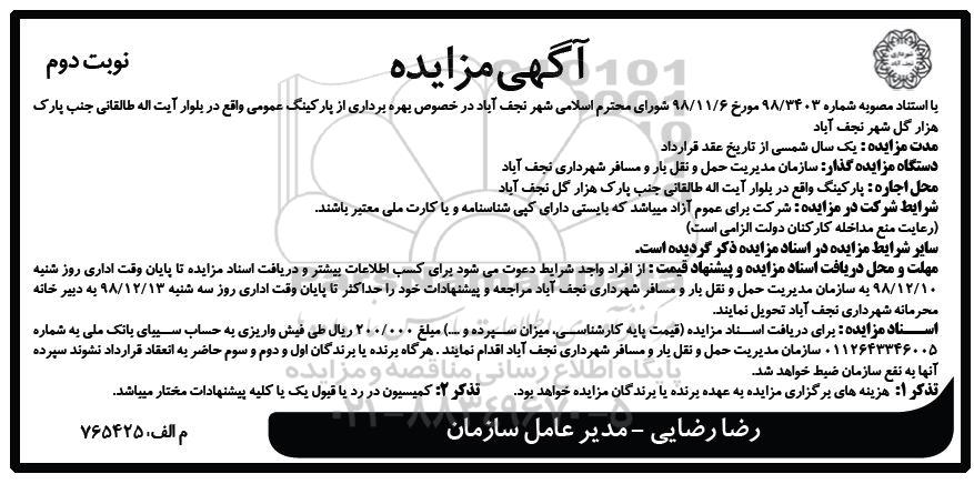 به استناد مصوبه شماره 3403/98 مورخ 98.11.6 شورای محترم اسلامی شهر نجف آباد در خصوص بهره برداری از پارکینگ عمومی واقع در بلوار آیت اله طالقانی جنب پارک هزار گل شهر نجف آباد