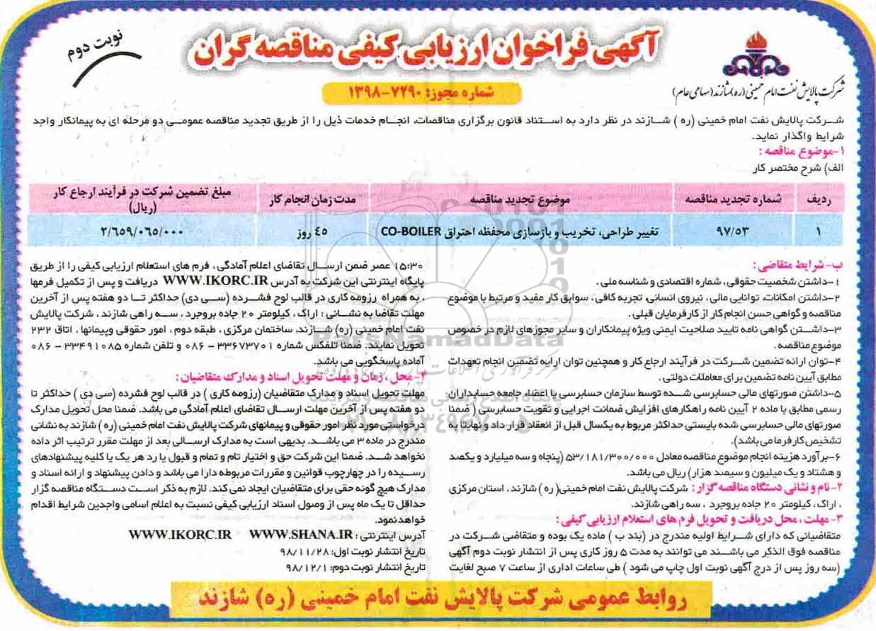 | 97/53 | تغییرات طراحی تخریب و بازسازی محفظه احتراق CO-BOILER | 45 روز | 2.659.065.000 |