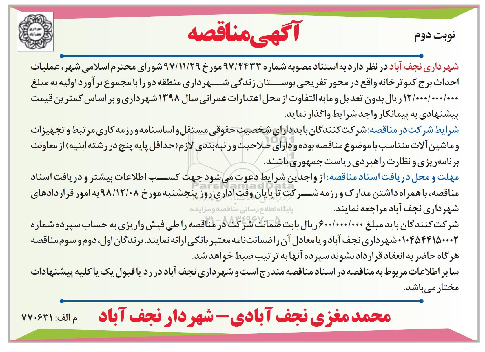 شهرداری نجف آباد در نظر دارد عملیات احداث برج کبوترخانه واقع در محور تفریحی بوستان زندگی شهرداری منطقه دو را با مجموع برآورد اولیه به مبلغ 12.000.000.000 ریال بدون تعدویل و مابه التفاوت از محل اعتبارات عمرانی سال 98 شهرداری و براساس کمترین قیمت پیشنهادی به پیمانکار واجد شرایط واگذار نماید.