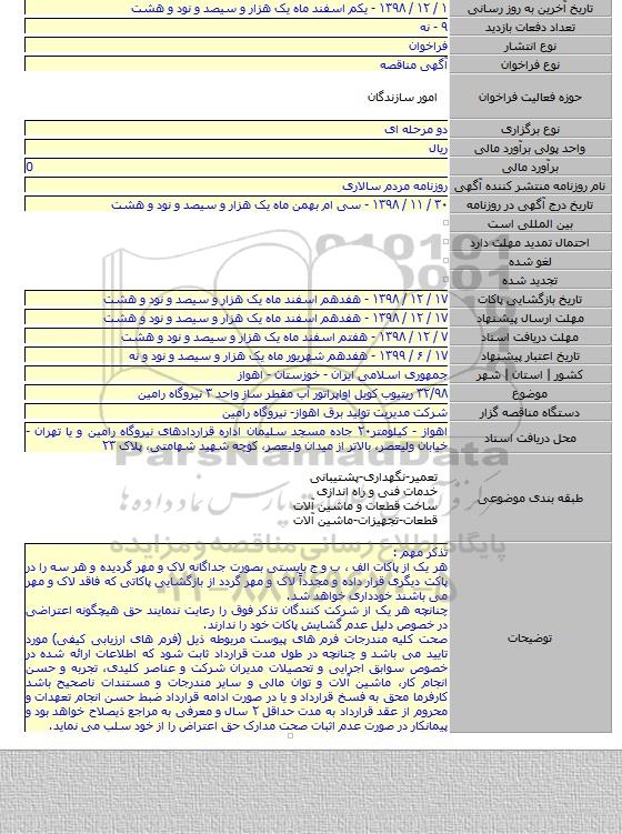 مناقصه, ۳۲/۹۸ ریتیوب کویل اواپراتور آب مقطر ساز واحد ۳ نیروگاه رامین از کلیه افراد متخصص و شرکتها واجد شرایط دعوت به عمل میآید در مناقصه با کد خبرگزاری پارس نماد: 2241759 شرکت نمایند.