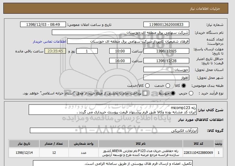 استعلام رله micomp123 ایران کد مشابه بوده وکالا طبق فرم پیشنهاد قیمت پیوست خریداری می گردد ., استعلام رله micomp123 ایران کد مشابه بوده وکالا طبق فرم پیشنهاد قیمت پیوست خریداری می گردد .