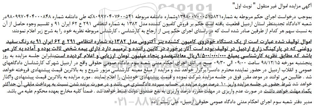 اموال توقیف شده عبارت است از یک دستگاه خودروی کامیون کشنده بنز آکتروس مدل 1382 به شماره انتظامی 291 ع 62 ایران 91 به رنگ سفید روغنی که در پارکینگ زارع اردبیل در توقیف بوده است آثار برخورد در کابین راننده و ترمییم دارد دارای بیمه شخص ثالث بوده و آماده به کار می باشد که مطابق نظریه کارشناسی بمبلغ 9/500/000/000ریال معادلنهصدو پنجاه میلیون تومان ارزیابی و اعلام گردیده استبنابراین جلسه مزایده به روز پنجشنبه مورخه 98/12/15 ساعت 09:00 الی 09:30 صبح در اتاق اجرای احکام مدنی شعبه سوم دادگاه عمومی حقوقی واقع در اردبیل شهرک کارشناسان دادگاههای عمومی و انقلاب اردبیل در حضور نماینده محترم دادسرا برگزار خواهد شد و مزایده از مبلغ معینه کارشناسی مزبور شروع و به بالاترین قیمت پیشنهادی فروخته خواهد شد . طالبین می توانند در موعد مقرر فوق در جلسه مزایده شرکت نموده و قیمت پیشنهادی خودشان را اعلام نمایند . مورد مزایده به بالاترین قیمت پیشنهادی واگذار خواهد شد شرط حضور در جلسه مزایده واریز 10 درصد مورد مزایده در حساب سپرده دادگستری می باشد و در صورت برنده شدن نسبت به پرداخت مابقی آن حداکثر یکماه مهلت خواهد داشت در صورت عدم واریزی در مهلت مقرره درصد واریزی به نفع صندوق دولت ضبط خواهد شد . ضمناً کلیه مخارج بعهده محکوم علیه می باشد.