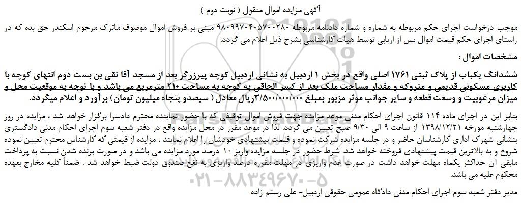 موجب درخواست اجرای حکم مربوطه به شماره و شماره دادنامه مربوطه 9809970405700280 مبنی بر فروش اموال موصوف ماترک مرحوم اسکندر حق بده که در راستای اجرای حکم قیمت اموال پس از اریابی توسط هیات کارشناسی بشرح ذیل اعلام می گردد.