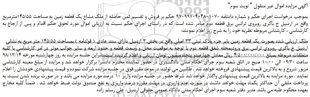 ملک ارزیابی شده بصورت یک قطعه زمین بایر جزء پلاک ثبتی 33 اصلی واقع در بخش 3 اردبیل دارای سند عادی ( قولنامه ) بمساحت 145/55 متر مربع به نشانی اردبیل خ باکری روبروی ترانس برق ورودیمحله شفق قطعه دوم با توجه به موقعیت محل و وسعت قطعه و حدود اربعه و سایر جوانب موثر در امر کارشناسی با کلیه متعلقات مربوطه بمبلغ 4/500/000/000 ریال معادل چهارصدو پنجاه میلیون تومان ارزیابی و اعلام گردیده استبنابراین جلسه مزایده به روز چهارشنبه مورخه 98/12/14 ساعت 09:30 الی 10:00 صبح در اتاق شعبه سوم جرای احکام مدنی دادگستری در حضور نماینده محترم دادسرا برگزار خواهد شد و مزایده از مبلغ معینه کارشناسی مزبور شروع و به بالاترین قیمت پیشنهادی فروخته خواهد شد . طالبین می توانند در موعد مقرر فوق در جلسه مزایده شرکت نموده و قیمت پیشنهادی خودشان را اعلام نمایند . مورد مزایده به بالاترین قیمت پیشنهادی واگذار خواهد شد شرط حضور در جلسه مزایده واریز 10 درصد مورد مزایده می باشد و در صورت برنده شدن نسبت به پرداخت مابقی آن حداکثر یکماه مهلت خواهد داشت در صورت عدم واریزی در مهلت مقرره درصد واریزی به نفع صندوق دولت ضبط خواهد شد . ضمناً کلیه مخارج بعهده محکوم علیه می باشد. مدیر دفتر شعبه سوم اجرای احکام مدنی دادگاه عمومی حقوقی اردبیل- علی رستم زاده