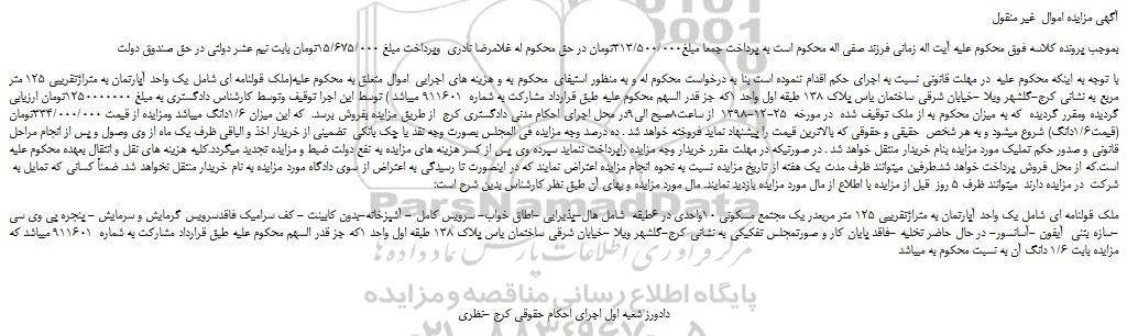 با توجه به اینکه محکوم علیه در مهلت قانونی نسبت به اجرای حکم اقدام ننموده است بنا به درخواست محکوم له و به منظور استیفای محکوم به و هزینه های اجرایی اموال متعلق به محکوم علیه(ملک قولنامه ای شامل یک واحد آپارتمان به متراژتقریبی 125 متر مربع به نشانی کرج-گلشهر ویلا -خیابان شرقی ساختمان یاس پلاک 138 طبقه اول واحد 1که جز قدر السهم محکوم علیه طبق قرارداد مشارکت به شماره 911601 میباشد ) توسط این اجرا توقیف وتوسط کارشناس دادگستری به مبلغ 1250000000تومان ارزیابی گردیده ومقرر گردیده که به میزان محکوم به از ملک توقیف شده در مورخه 25-12-1398 از ساعت8صبح الی9در محل اجرای احکام مدنی دادگستری کرج از طریق مزایده بفروش برسد. که این میزان 1/6دانگ میباشد ومزایده از قیمت 334/000/000تومان (قیمت1/6دانگ) شروع میشود و به هر شخص حقیقی و حقوقی که بالاترین قیمت را پیشنهاد نماید فروخته خواهد شد . ده درصد وجه مزایده فی المجلس بصورت وجه نقد یا چک بانکی تضمینی از خریدار اخذ و الباقی ظرف یک ماه از وی وصول و پس از انجام مراحل قانونی و صدور حکم تملیک مورد مزایده بنام خریدار منتقل خواهد شد . در صورتیکه در مهلت مقرر خریدار وجه مزایده راپرداخت ننماید سپرده وی پس از کسر هزینه های مزایده به نفع دولت ضبط و مزایده تجدید میگردد.کلیه هزینه های نقل و انتقال بعهده محکوم علیه است.که از محل فروش پرداخت خواهد شد.طرفین میتوانند ظرف مدت یک هفته از تاریخ مزایده نسبت به نحوه انجام مزایده اعتراض نمایند که در اینصورت تا رسیدگی به اعتراض از سوی دادگاه مورد مزایده به نام خریدار منتقل نخواهد شد. ضمناً کسانی که تمایل به شرکت در مزایده دارند میتوانند ظرف 5 روز قبل از مزایده با اطلاع از مال مورد مزایده بازدید نمایند. مال مورد مزایده و بهای آن طبق نظر کارشناس بدین شرح است: