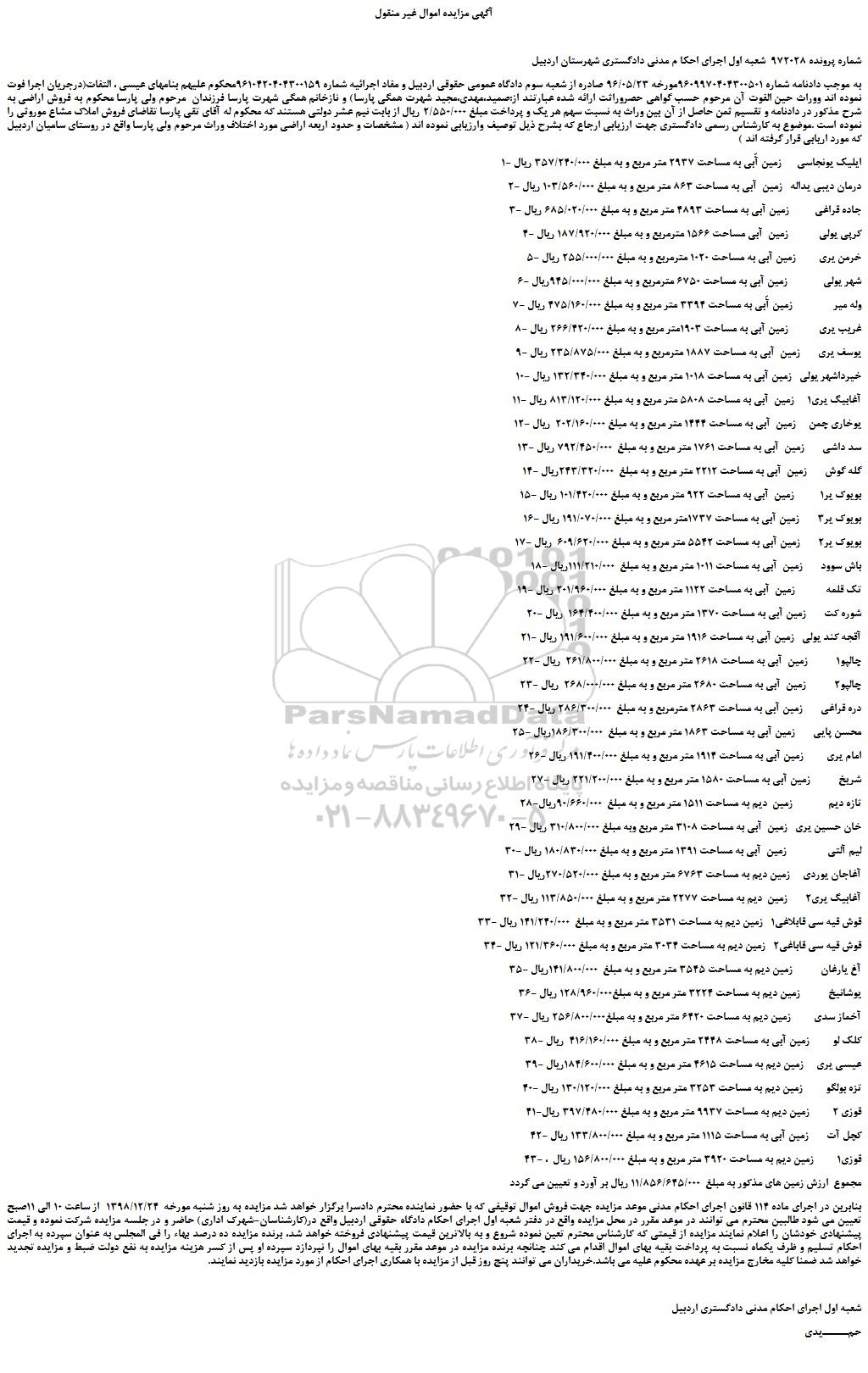 به موجب دادنامه شماره 9609970404300501مورخه 96/05/23 صادره از شعبه سوم دادگاه عمومی حقوقی اردبیل و مفاد اجرائیه شماره 9610420404300159محکوم علیهم بنامهای عیسی ، التفات(درجریان اجرا فوت نموده اند ووراث حین الفوت آن مرحوم حسب گواهی حصروراثت ارائه شده عبارتند از:صمید،مهدی،مجید شهرت همگی پارسا) و نازخانم همگی شهرت پارسا فرزندان مرحوم ولی پارسا محکوم به فروش اراضی به شرح مذکور در دادنامه و تقسیم ثمن حاصل از آن بین وراث به نسبت سهم هر یک و پرداخت مبلغ 2/550/000 ریال از بابت نیم عشر دولتی هستند که محکوم له آقای تقی پارسا تقاضای فروش املاک مشاع موروثی را نموده است .موضوع به کارشناس رسمی دادگستری جهت ارزیابی ارجاع که بشرح ذیل توصیف وارزیابی نموده اند ( مشخصات و حدود اربعه اراضی مورد اختلاف وراث مرحوم ولی پارسا واقع در روستای سامیان اردبیل که مورد اریابی قرار گرفته اند )