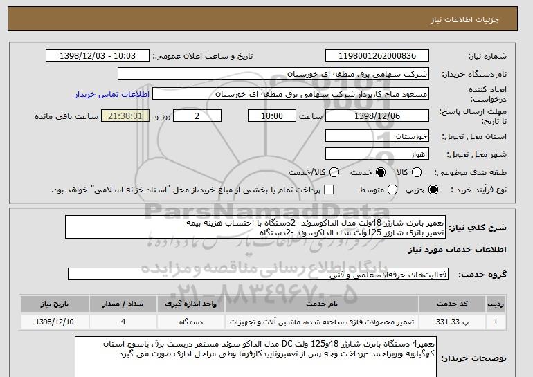 توضیحات خریدارتعمیر4 دستگاه باتری شارژر 48و125 ولت DC مدل الداکو سوئد مستقر درپست برق یاسوج استان کهگیلویه وبویراحمد -پرداخت وجه پس از تعمیروتاییدکارفرما وطی مراحل اداری صورت می گیرد