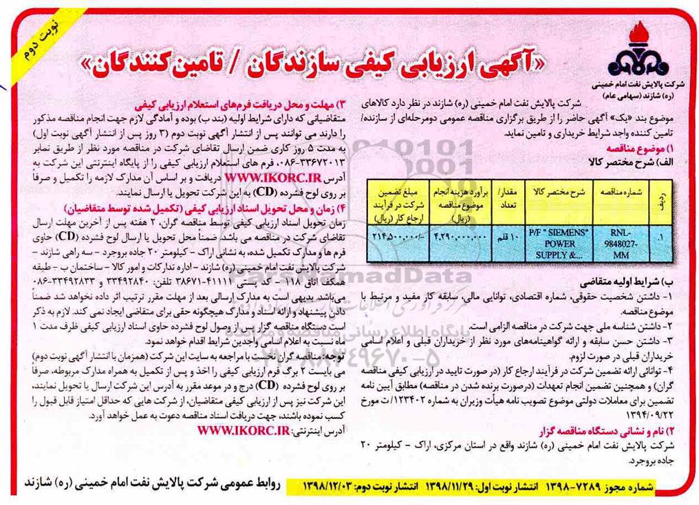 ارزیابی کیفی P/F SIEMENS POWER ... - نوبت دوم از کلیه افراد متخصص و شرکتها واجد شرایط دعوت به عمل میآید در مناقصه با کد خبرگزاری پارس نماد: 2243230 شرکت نمایند.