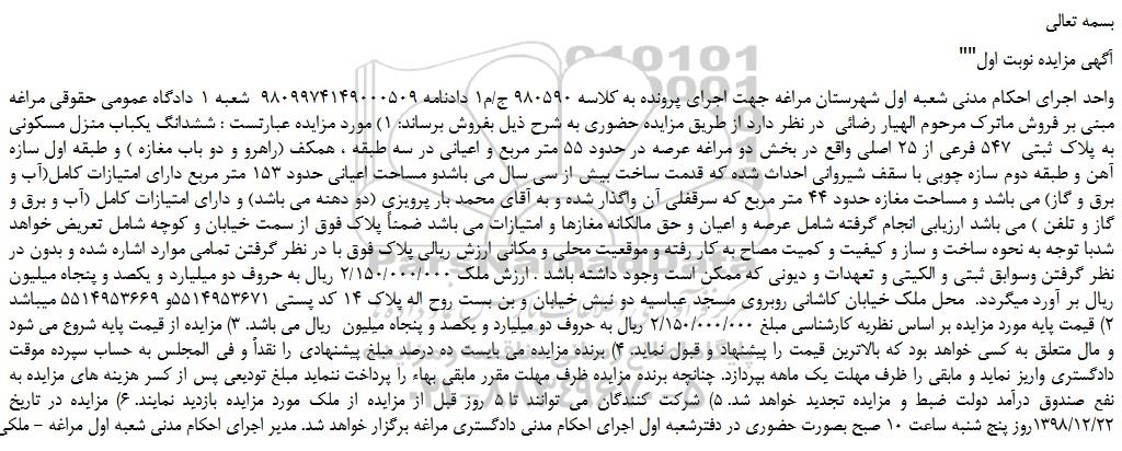 واحد اجرای احکام مدنی شعبه اول شهرستان مراغه جهت اجرای پرونده به کلاسه 980590 ج/م1 دادنامه 9809974149000509 شعبه 1 دادگاه عمومی حقوقی مراغه مبنی بر فروش ماترک مرحوم الهیار رضائی در نظر دارد از طریق مزایده حضوری به شرح ذیل بفروش برساند: 1) مورد مزایده عبارتست : ششدانگ یکباب منزل مسکونی به پلاک ثبتی 547 فرعی از 25 اصلی واقع در بخش دو مراغه عرصه در حدود 55 متر مربع و اعیانی در سه طبقه ، همکف (راهرو و دو باب مغازه ) و طبقه اول سازه آهن و طبقه دوم سازه چوبی با سقف شیروانی احداث شده که قدمت ساخت بیش از سی سال می باشدو مساحت اعیانی حدود 153 متر مربع دارای امتیازات کامل(آب و برق و گاز) می باشد و مساحت مغازه حدود 44 متر مربع که سرقفلی آن واگذار شده و به آقای محمد بار پرویزی (دو دهنه می باشد) و دارای امتیازات کامل (آب و برق و گاز و تلفن ) می باشد ارزیابی انجام گرفته شامل عرصه و اعیان و حق مالکانه مغازها و امتیازات می باشد ضمناً پلاک فوق از سمت خیابان و کوچه شامل تعریض خواهد شدبا توجه به نحوه ساخت و ساز و کیفیت و کمیت مصاح به کار رفته و موقعیت محلی و مکانی ارزش ریالی پلاک فوق با در نظر گرفتن تمامی موارد اشاره شده و بدون در نظر گرفتن وسوابق ثبتی و الکیتی و تعهدات و دیونی که ممکن است وجود داشته باشد . ارزش ملک 2/150/000/000 ریال به حروف دو میلیارد و یکصد و پنجاه میلیون ریال بر آورد میگردد. محل ملک خیابان کاشانی روبروی مسجد عباسیه دو نبش خیابان و بن بست روح اله پلاک 14 کد پستی 5514953671و 5514953669 میباشد 2) قیمت پایه مورد مزایده بر اساس نظریه کارشناسی مبلغ 2/150/000/000 ریال به حروف دو میلیارد و یکصد و پنجاه میلیون ریال می باشد. 3) مزایده از قیمت پایه شروع می شود و مال متعلق به کسی خواهد بود که بالاترین قیمت را پیشنهاد و قبول نماید. 4) برنده مزایده می بایست ده درصد مبلغ پیشنهادی را نقداً و فی المجلس به حساب سپرده موقت دادگستری واریز نماید و مابقی را ظرف مهلت یک ماهه بپردازد. چنانچه برنده مزایده ظرف مهلت مقرر مابقی بهاء را پرداخت ننماید مبلغ تودیعی پس از کسر هزینه های مزایده به نفع صندوق درآمد دولت ضبط و مزایده تجدید خواهد شد. 5) شرکت کنندگان می توانند تا 5 روز قبل از مزایده از ملک مورد مزایده بازدید نمایند. 6) مزایده در تاریخ 1398/12/22روز پنج شنبه ساعت 10 صبح بصورت حضوری در دفترشعبه اول اجرای احکام مدنی دادگستری مراغه برگزار خواهد شد. مدیر اجرای احکام مدنی شعبه اول مراغه - ملکی