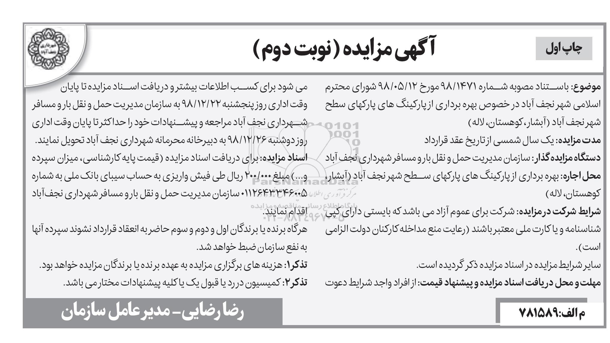 دستگاه مزایده گذار: سازمان مدیریت حمل و نقل بار و مسافر شهرداری نجف آباد