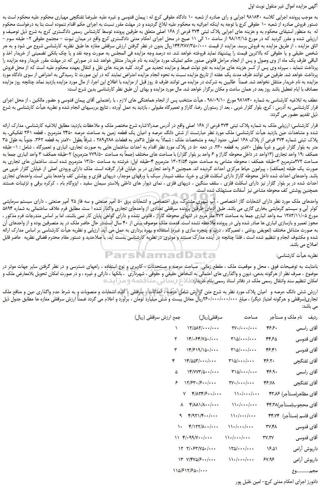 به موجب پرونده اجرایی کلاسه 981840 اجرایی و رای صادره از شعبه 10 دادگاه حقوقی کرج له : پیمان قدوسی و غیره علیه علیرضا تفنگچی مهیاری محکوم علیه محکوم است به دستور فروش صادره از شعبه 10 حقوقی کرج با توجه به اینکه اجرائیه به محکوم علیه ابلاغ گردیده و در مهلت مقرر نسبت به اجرای حکم اقدام ننموده است بنا به درخواست محکوم له به منظور استیفای محکوم به و هزینه های اجرایی پلاک ثبتی 374 فرعی از 168 اصلی متعلق به طرفین پرونده توسط کارشناس رسمی دادگستری کرج به شرح ذیل توصیف و ارزیابی شده و مقرر گردید که در مورخ 98/12/15 از ساعت 10 الی 11 صبح در محل اجرای احکام مدنی دادگستری کرج واقع در میدان نبوت - مجتمع حقوقی 2- طبقه سوم - اتاق مزایده ، از طریق مزایده به فروش برسد. مزایده از قیمت 144/387/350/000ریال بدون در نظر گرفتن ارزش سرقفلی مغازه ها طبق نظریه کارشناسی شروع می شود و به هر شخص حقیقی و یا حقوقی که بالاترین قیمت را پیشنهاد نماید فروخته خواهد شد. ده درصد وجه مزایده فی المجلس به صورت وجه نقد و یا چک بانکی تضمینی از خریدار اخذ و الباقی ظرف یک ماه از وی وصول و پس از انجام مراحل قانونی صدور حکم تملیک مورد مزایده به نام خریدار منتقل خواهد شد در صورتی که در مهلت مقرر خریدار وجه مزایده را پرداخت ننماید ، سپرده وی پس از کسر هزینه های مزایده به نفع دولت ضبط و مزایده تجدید می گردد. کلیه هزینه های نقل و انتقال بعهده محکوم علیه است که از محل فروش پرداخت خواهد شد. طرفین می توانند ظرف مدت یک هفته از تاریخ مزایده نسبت به نحوه انجام مزایده اعتراض نمایند که در این صورت تا رسیدگی به اعتراض از سوی دادگاه مورد مزایده به نام خریدار منتقل نخواهد شد. ضمناً طالبین به شرکت در مزایده می توانند ظرف 5 روز قبل از مزایده با اطلاع این اجرا، از مال مورد مزایده بازدید نماند چنانچه روز مزایده مصادف با ایام تعطیل باشد روز بعد در همان ساعت و مکان برگزار خواهد شد. مال مورد مزایده و بهای آن طبق نظر کارشناسی بدین شرح است: