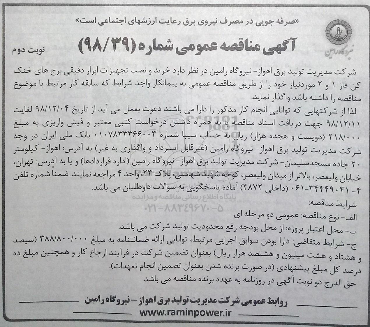 لذا از شرکتهایی که توانایی انجام کار مذکور را دارا می باشند دعوت به عمل می آید از تاریخ 98.12.4 لغایت 98.12.11 جهت دریافت اسناد مناقصه یا به همراه داشتن درخواست کتبی و فیش واریزی به مبلغ 218.000 (دویست و هجده هزار) ریال به حساب سیبا به شماره 0107833366003 بانک ملی ایران در وجه شرکت مدیریت تولید برق اهواز - نیروگاه رامین (غیر قابل استرداد و واگذاری به غیر) به آدرس : اهواز ، کیلومتر 20 جاده مسجدسلیمان ، شرکت مدیریت تولید برق اهواز ، نیروگاه رامین اداره قراردادها و یا به آدرس تهران - خیابان ولیعصر - بالاتر از میدان ولی عصر - کوچه شهید شهامتی - پلاک 23 واحد 4 مراجعه نمایند. ضمنا شماره تلفن 4-34449041-061 داخلی 4872 آماده پاسخگویی به سئوالات داوطلبان می باشد.