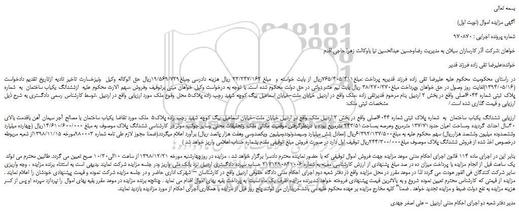 در راستای محکومیت محکوم علیه علیرضا تقی زاده فرزند قدیربه پرداخت :مبلغ765/405/411ریال از بابت خواسته و مبلغ 23/247/162 ریال هزینه دادرسی ومبلغ19/569/729ریال حق الوکاله وکیل ونیزخسارت تاخیر تادیه ازتاریخ تقدیم دادخواست (1394/05/16)لغایت روز وصول در حق خواهان وپرداخت مبلغ38/270/270 ریال بابت نیم عشر دولتی در حق دولت محکوم شده است. با توجه به درخواست وکیل خواهان مبنی برتوقیف وفروش ،سهم الارث محکوم علیه ازششدانگ یکباب ساختمان به شماره پلاک ثبتی شماره 6044اصلی واقع در بخش 2 اردبیل بنام مرحوم قدیرتقی زاده ،ملک واقع در اردبیل خیابان ملت-خیابان اسماعیل بیگ کوچه شهید رجب زاده پلاک5 محل وقوع ملک مورد ارزیابی واقع در اردبیل ،توسط کارشناس رسمی دادگستری به شرح ذیل ارزیابی و قیمت گذاری شده است./ مشخصات ثبتی ملک: