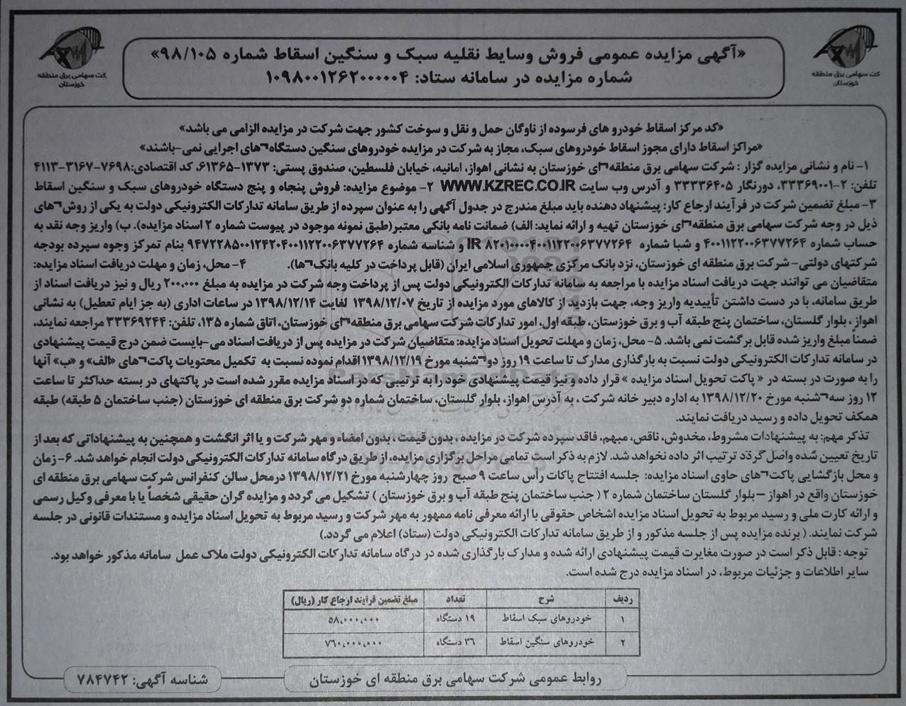 آگهی مزایده عمومی فروش وسایط نقلیه سبک و سنگین اسقاط شماره 98/105 ؟
