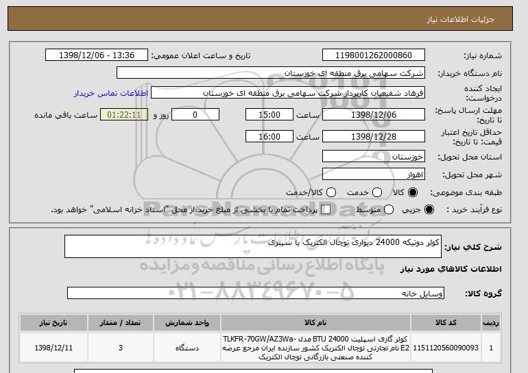 شرح کلی نیاز: کولر دوتیکه 24000 دیواری توچال الکتریک یا سیبری