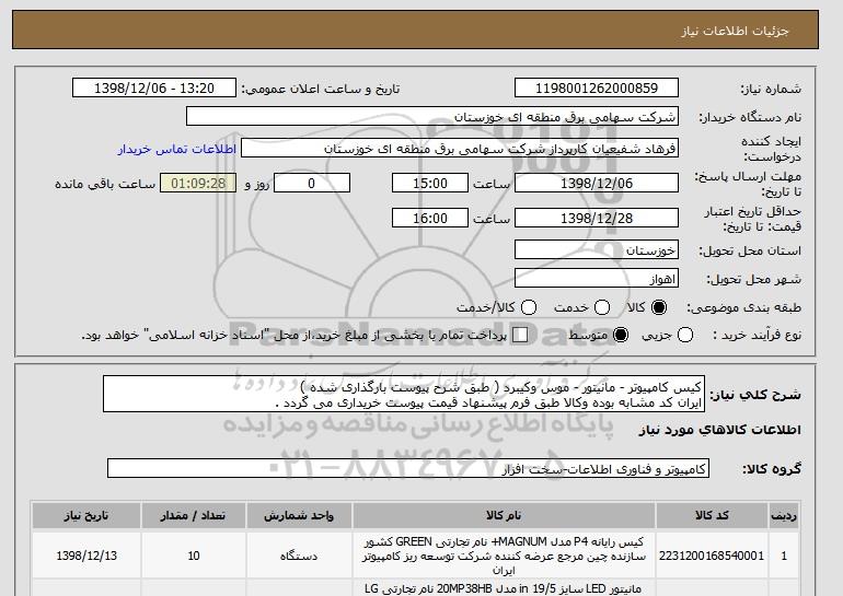 شرح کلی نیاز: کیس کامپیوتر - مانیتور - موس وکیبرد ( طبق شرح پیوست بارگذاری شده ) ایران کد مشابه بوده وکالا طبق فرم پیشنهاد قیمت پیوست خریداری می گردد .