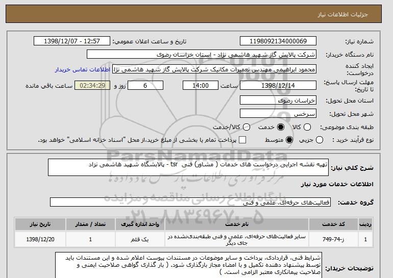 شرح کلی نیاز: تهیه نقشه اجرایی درخواست های خدمات ( مشاور) فنی tsr - پالابشگاه شهید هاشمی نزاد