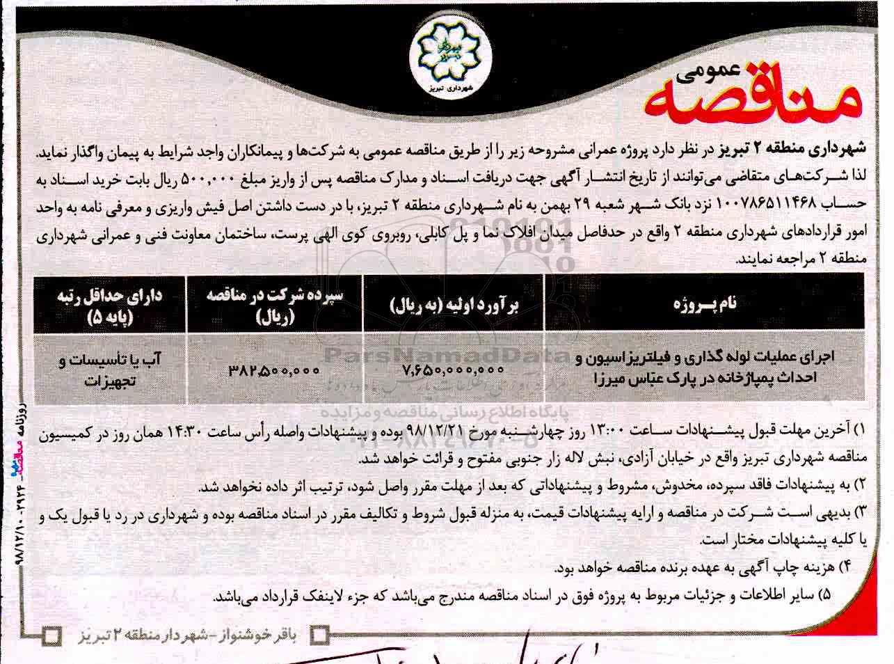 شهرداری منطقه 2 تبریز در نظر دارد  عمرانی مشروحه زیر را از طریق مناقصه عمومی به شرکت ها و پیمانکاران واجد شرایط به پیمان واگذار نماید