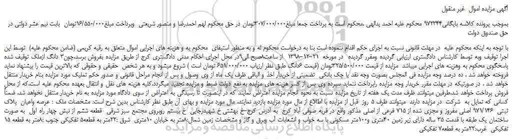 با توجه به اینکه محکوم علیه در مهلت قانونی نسبت به اجرای حکم اقدام ننموده است بنا به درخواست محکوم له و به منظور استیفای محکوم به و هزینه های اجرایی اموال متعلق به رقیه کریمی (ضامن محکوم علیه) توسط این اجرا توقیف وبه توسط کارشناس دادگستری ارزیابی گردیده ومقرر گردیده در مورخه 21-12-1398 از ساعت8صبح الی9در محل اجرای احکام مدنی دادگستری کرج از طریق مزایده بفروش برسد.چون3 دانگ ازملک توقیف شده پاسخگوی محکوم به وهزینه های اجرایی میباشد مزایده از قیمت 325/500/000تومان (قیمت 6دانگ طبق نظر ارزیاب 651/000/000 تومان است ) شروع میشود و به هر شخص حقیقی و حقوقی که بالاترین قیمت را پیشنهاد نماید فروخته خواهد شد . ده درصد وجه مزایده فی المجلس بصورت وجه نقد یا چک بانکی تضمینی از خریدار اخذ و الباقی ظرف یک ماه از وی وصول و پس از انجام مراحل قانونی و صدور حکم تملیک مورد مزایده بنام خریدار منتقل خواهد شد . در صورتیکه در مهلت مقرر خریدار وجه مزایده راپرداخت ننماید سپرده وی پس از کسر هزینه های مزایده به نفع دولت ضبط و مزایده تجدید میگردد.کلیه هزینه های نقل و انتقال بعهده محکوم علیه است.که از محل فروش پرداخت خواهد شد.طرفین میتوانند ظرف مدت یک هفته از تاریخ مزایده نسبت به نحوه انجام مزایده اعتراض نمایند که در اینصورت تا رسیدگی به اعتراض از سوی دادگاه مورد مزایده به نام خریدار منتقل نخواهد شد. ضمناً کسانی که تمایل به شرکت در مزایده دارند میتوانند ظرف 5 روز قبل از مزایده با اطلاع از مال مورد مزایده بازدید نمایند. مال مورد مزایده و بهای آن طبق نظر کارشناس بدین شرح است: مشخصات ملک : عرصه واعیان پلاک ثبتی 971/146 اصلی مفروز و مجزی شده از 715 فرعی از اصلی مذکور واقع در قریه صوفی آباد کرج به آدرس کرج-خ بهشتی خ شهیدرجایی خ بیستم روبروی مجتمع سبز شرقی قطعه ششم از نبش چهار راه اول به صورت ساختمان یک طبقه با قدمت 35 ساله دارای زیر زمین 40متری و100متر مسکونی با سه خواب و انشعابات آب وبرق و گاز و مشخصات زمین شمال:8متر به خیابان 10متری شرق :22متر به قطعه5 تفکیکی جنوب :8متر به قطعه 15 تفکیکی غرب:22متر به قطعه7 تفکیکی