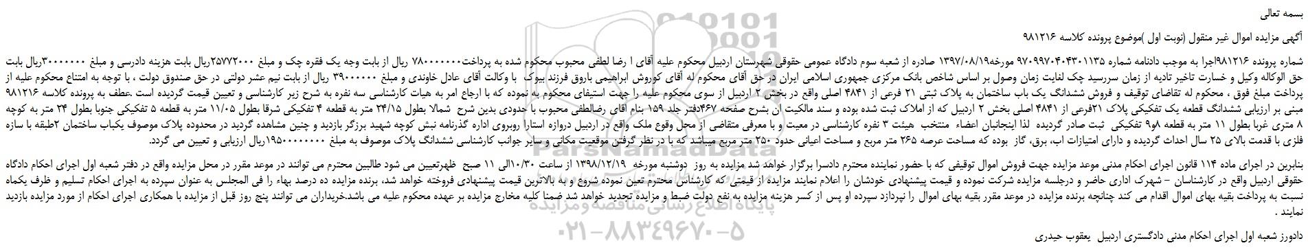 آگهی مزایده اموال غیر منقول (نوبت اول )موضوع پرونده کلاسه 981216