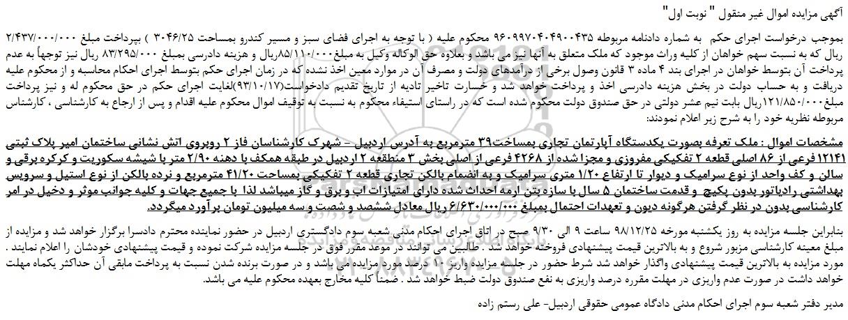شعبه صادر کننده:شعبه سوم اجرای احکام مدنی دادگستری شهرستان اردبیل