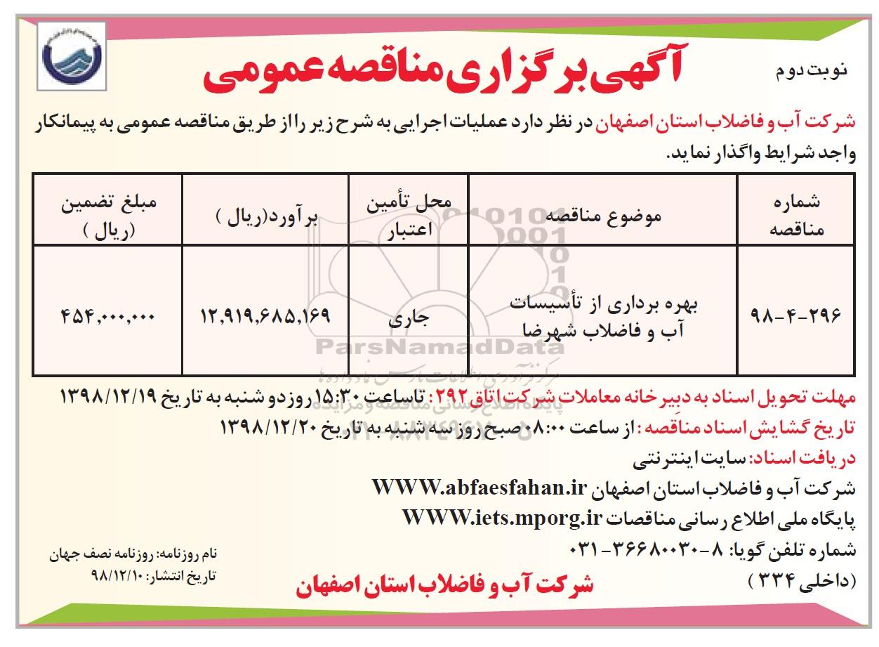 مناقصه بهره برداری از تاسیسات آب و فاضلاب نوبت دوم , مناقصه عمومی , مناقصه بهره برداری از تاسیسات آب و فاضلاب نوبت دوم