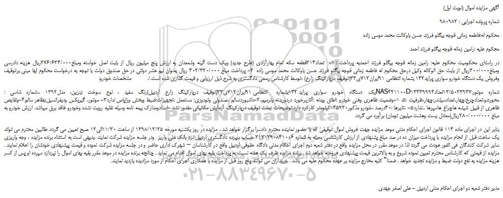 بنابر این در اجرای ماده 114 قانون اجرای احکام مدنی موعد مزایده جهت فروش اموال توقیفی که با حضور نماینده محترم دادسرا برگزار خواهد شد ، مزایده در روز یکشنبه مورخه 1398/12/25 از ساعت 11/30الی12 صبح تعیین می گردد. طالبین محترم می تواند یک ساعت قبل از انجام مزایده با پرداخت میزان ده در صد مبلغ پشنهادی از ارزش کارشناسی معینه به شماره 2171290841006 حساب سپرده دادگستری اردبیل نزد بانک ملی واریز ودر جلسه مزایده شرکت نمایند .بدیهی است به استثناء برنده مزایده ، وجه واریزی سایر شرکت کنندگان فی الفور عودت می گردد لذا در موعد مقرر در محل مزایده واقع در دفتر شعبه دوم اجرای احکام مدنی دادگاه حقوقی اردبیل واقع در کارشناسان – شهرک اداری حاضر و در جلسه مزایده شرکت نموده و قیمت پیشنهادی خودشان را اعلام نمایند . مزایده از قیمتی که کارشناس محترم تعیین نموده شروع و به بالاترین قیمت پیشنهادی فروخته خواهد شد . برنده مزایده ظرف یک هفته نسبت به پرداخت بقیه بهای اموال اقدام می نماید . چنانچه برنده مزایده در موعد مقرر بقیه بهای اموال را نپردازد سپرده او پس از کسر هزینه مزایده به نفع دولت ضبط و مزایده تجدید خواهد . ضمنا" کلیه مخارج مزایده بر عهده محکوم علیه می باشد . خریداران می توانند پنج روز قبل از مزایده با همکاری اجرای احکام از مورد مزادیده بازدید نمایند.
