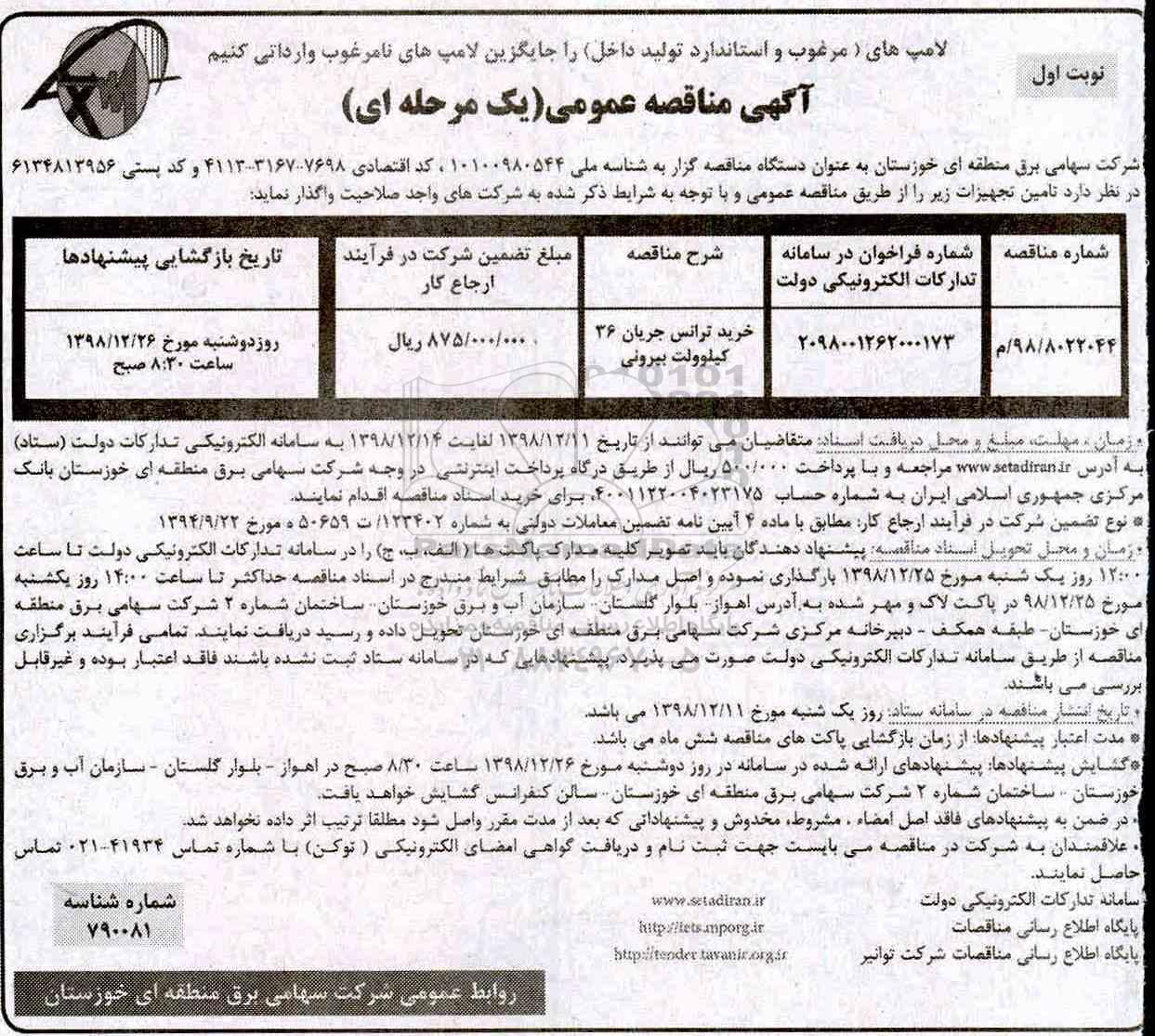 گشایش پیشنهادها: پیشنهادهای ارائه شده در سامانه در روز دوشنبه مورخ 98.12.26 ساعت 8.30 صبح در اهناز بلوار گلستان، سازمان اب و برق خوزستان، ساختمان شماره 2 شرکت سهامی برق منطقه ای خوزستان سالن کنفرانس گشایش خواهد یافت
