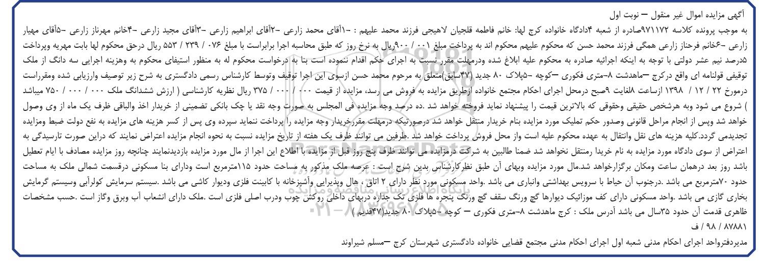 مزایده سه دانگ ملک توقیفی قولنامه ای نوبت اول , آگهی مزایده مزایده سه دانگ ملک توقیفی قولنامه ای نوبت اول