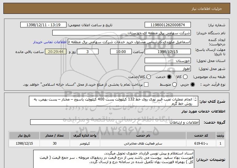 شرح کلی نیاز: انجام عملیات نصب فیبر نوری روی خط 132 کیلوولت پست 400 کیلوولت یاسوج – مختار – پست بهمن، به روش خط گرم مطابق شرح پیوست 30کیلومتر