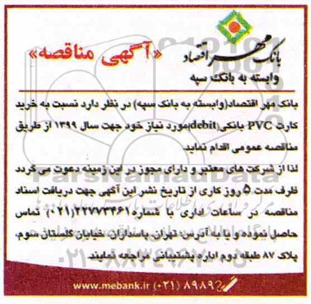 بانک مهر اقتصاد ( وابسته به بانک سپه ) درنظردارد نسبت به خرید کارت pvc بانکی debit مورد نیاز خود جهت سال 1399 از طریق مناقصه عمومی اقدام نمایند