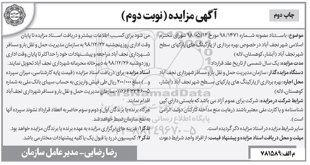 مهلت و محل دریافت اسناد مزایده و پیشنهاد قیمت: از افراد واجد شرایط دعوت میشود برای کسب اطلاعات بیشتر و دریافت اسناد مزایده تا پایان وقت اداری روز پنجشنبه 98.12.22 به سازمان مدیریت حمل و نقل شهرداری مراجعه و پیشنهادات خود را حداکثر تا پایان وقت اداری روز دوشنبه 98.12.26 به دبیرخانه محرمانه شهرداری نجف آباد تحویل نمایند.