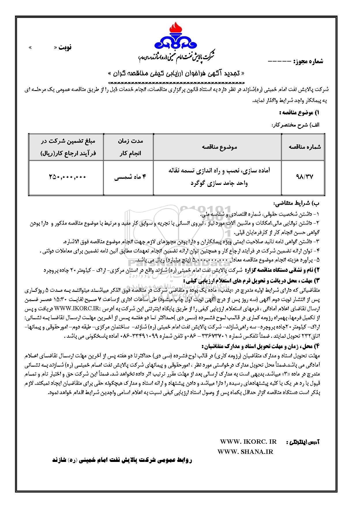 3- مهلت، محل دریافت و تحویل فرم های استعلام ارزیابی کیفی: متقاضیانی که دارای شرایط اولیه مندرج در بند ب ماده یک بوده و متقاضی شرکت در مناقصه فوق الذکر می باشد می توانند به مدت 5 روز کاری پس از انتشار نوبت دوم آگهی سه روز پس از درج آگهی نوبت اول چاپ می شود طی ساعات اداری از ساعت 7 صبح لغایت 15.30 عصر ضمن ارسال تقاضای اعلام آمادگی فرم های استعلام ارزیابی کیفی را از طریق پایگاه اینترنتی این شرکت به آدرس WWW.IKORC.IR دریافت و پس از تکمیل فرم ها به همراه رزومه کاری در قالب لوح فشرده سی دی حداکث تا دو هفته پس از آخرین مهلت تقاضا به نشانی اراک، کیلومتر 20 جاده بروجردف سه راهی شازند، شرکت پالایش نفت امام خمینی ره شازند، ساختمان مرکزی، طبقه دوم، امور حقوقی و پیمان ها اتاق 232 تحویل نمایند ضمنا تلفکس شماره 33673701-086 و تلفن شماره 33491099-086 آماده پاسخگویی می باشد