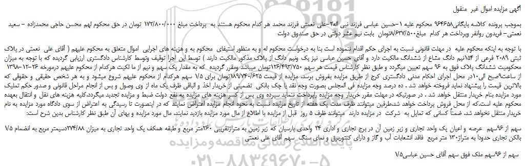 بموجب پرونده کلاسه بایگانی964658 محکوم علیه 1-حسین عباسی فرزند نبی اله2-علی نعمتی فرزند محمد هر کدام محکوم هستند به  پرداخت مبلغ 172/800/000 تومان در حق محکوم لهم محسن حاجی محمدزاده - سعید نعمتی- فریدون روانفر وپرداخت هر کدام  مبلغ8/637/500تومان  بابت نیم عشر دولتی در حق صندوق دولت