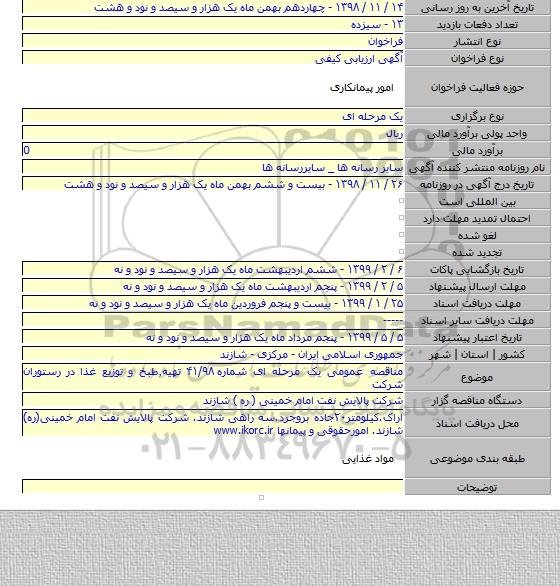 مناقصه عمومی یک مرحله ای شماره ۴۱/۹۸ تهیه٫طبخ و توزیع غذا در رستوران شرکت