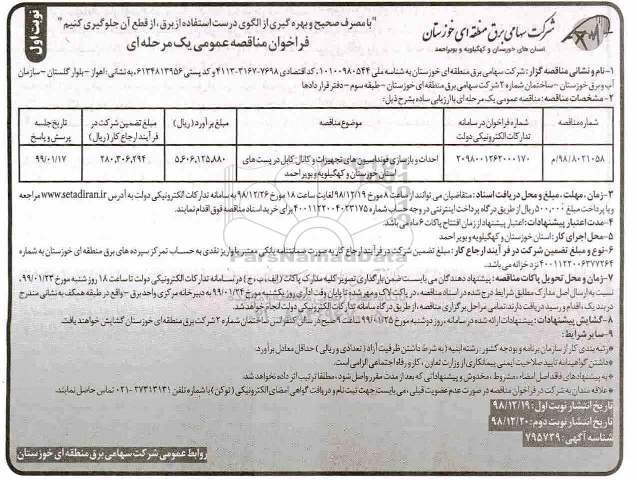 | 98/8021058/م | 2098001262000170 | احداث و بازسازی فونداسیون های تجهیزات و کانال کابل در پست های استان خوزستان و کهگیلویه و بویراحمد |