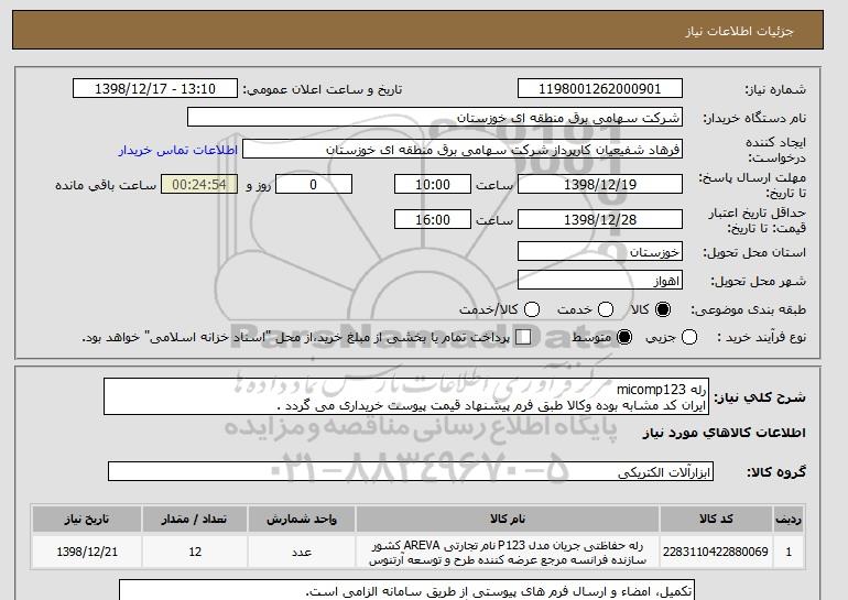 استعلام بها و موضوع استعلام استعلام رله micomp123 ایران کد مشابه بوده وکالا طبق فرم پیشنهاد قیمت پیوست خریداری می گردد . به اطلاع کلیه شرکتها و افراد متخصص واجد شرایط میرساند، آگهی گذار در نظر دارد از طریق استعلام بها، نسبت به انتخاب و دریافت پیشنهادات اقدام نماید. این استعلام با کد آگهی ثبت شده در سامانه خبرگزاری پارس نماد : 2281027 منتشر شده است. مشخصات استعلام : تاریخ شروع استعلام: 1398/12/17 آخرین مهلت ارسال پیشنهاد قیمت : 1398/12/19 و محل اجرای پروژه : استان خوزستان میباشد. استعلام قیمت مورد درخواست : استعلام رله micomp123 ایران کد مشابه بوده وکالا طبق فرم پیشنهاد قیمت پیوست خریداری می گردد . با دستهبندیهای تخصصی و گروه های مرتبط : ابزار دقیق, تجهیزات برق و الکترونیک, استعلام اطلاع رسانی میگردد.