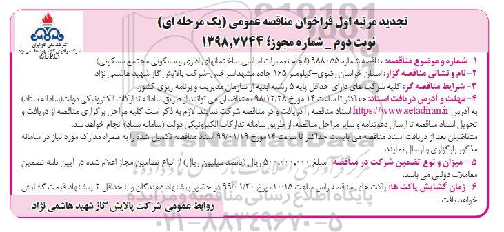تجدید مناقصه انجام تعمیرات اساسی ساختمان های اداری و مسکونی مجتمع مسکونی - نوبت دوم, تجدید مناقصه انجام تعمیرات اساسی ساختمان های اداری و مسکونی مجتمع مسکونی - نوبت دوم