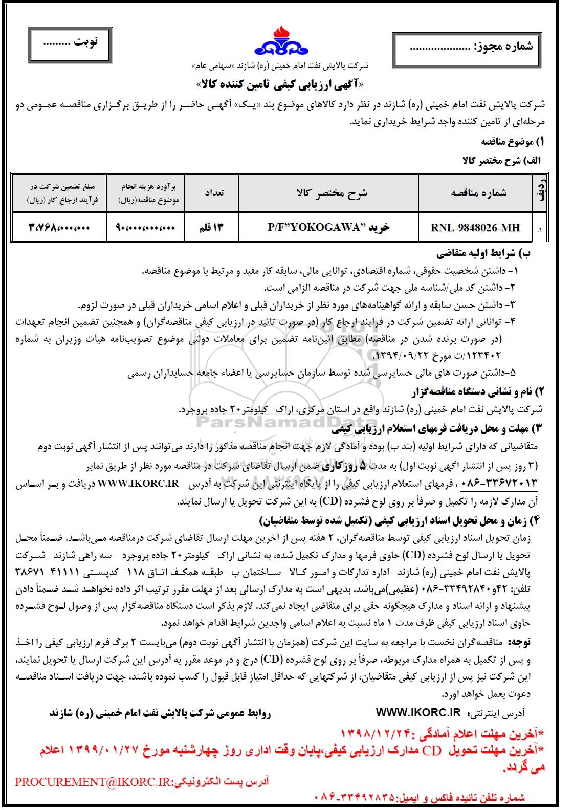 آگهی ارزیابی کیفی خرید P/F YOKOGAWA از کلیه افراد متخصص و شرکتها واجد شرایط دعوت به عمل میآید در مناقصه با کد خبرگزاری پارس نماد: 2282506 شرکت نمایند.
