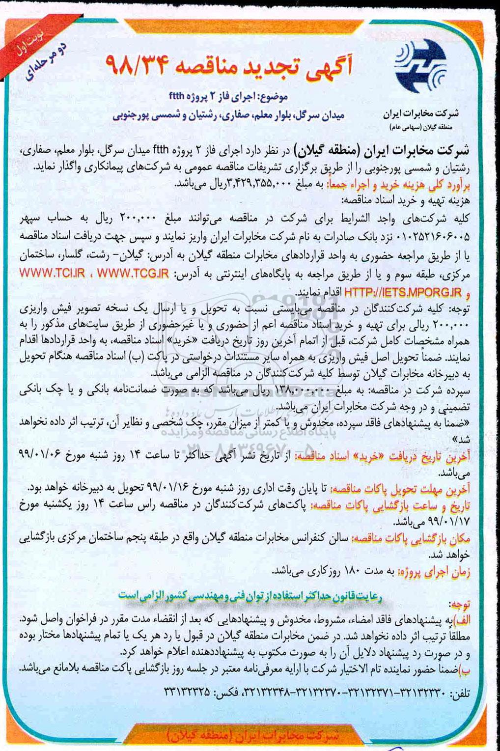 شرکت مخابرات ایران (منطقه گیلان) در نظر دارد پروژه اجرای فاز 2 پروژه ftth میدان سرگل ، بلوار معلم ، صفاری ، رشتیان و شمسی پور جنوبی را از طریق برگزاری تشریفات مناقصه عمومی به شرکتهای پیمانکاری واگذار نماید