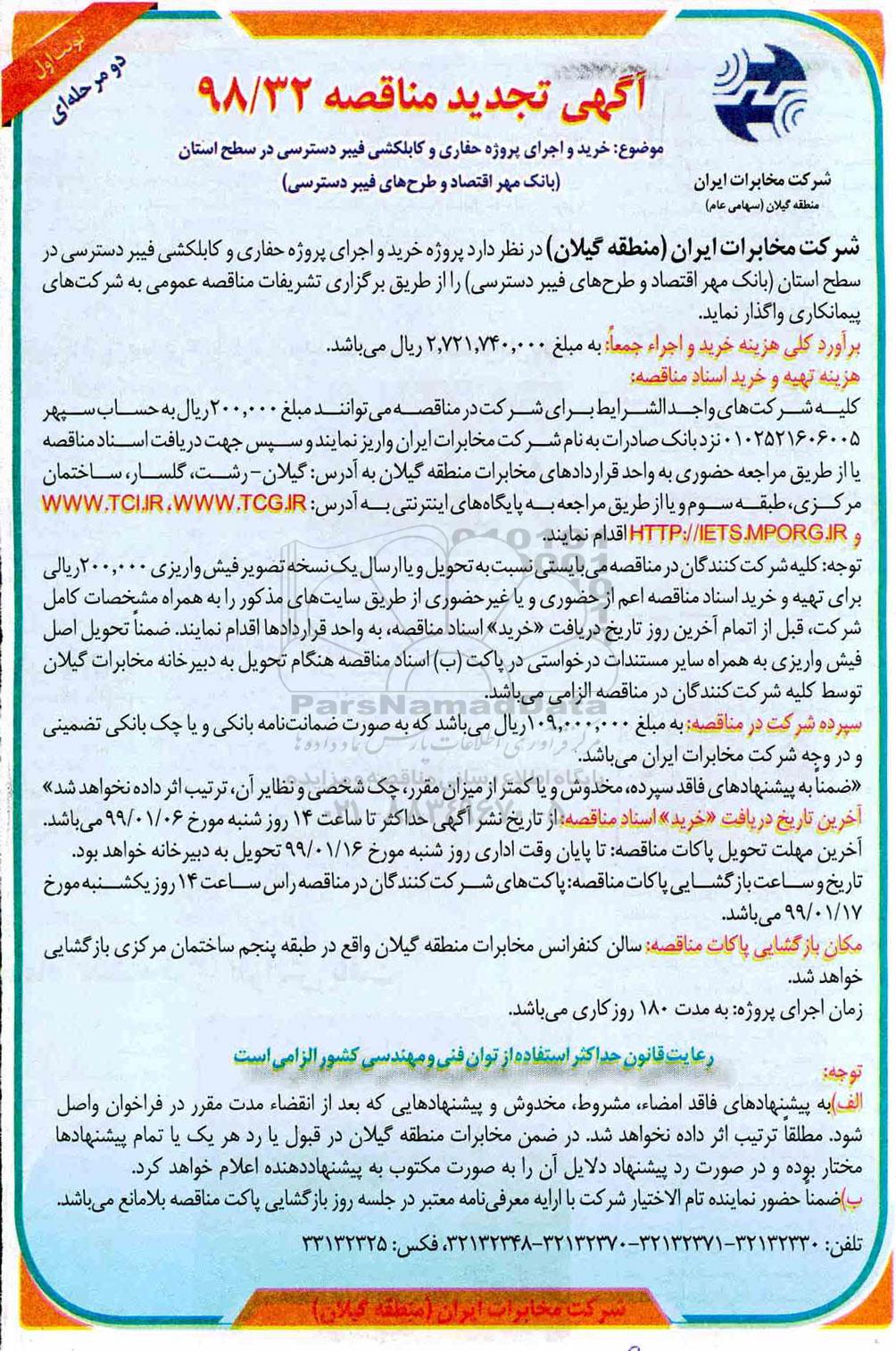 شرکت مخابرات ایران منطقه گیلان در نظر دارد پروژه خرید و اجرای پروژه حفاری و کابلکشی فیبر دسترسی در سطح استان (بانک مهر اقتصاد و طرح های فیبر دسترسی) را از طریق برگزاری تشریفات مناقصه عمومی به شرکتهای پیمانکاری واگذار نماید.