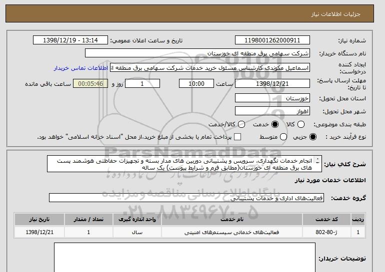 شرح کلی نیاز: انجام خدمات نگهداری، سرویس و پشتیبانی دوربین های مدار بسته و تجهیزات حفاظتی هوشمند پست های برق منطقه ای خوزستان(مطابق فرم و شرایط پیوست) یک ساله