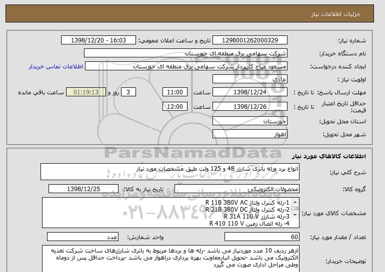 شرح کلی نیاز: انواع برد ورله باتری شارژر 48 و 125 ولت طبق مشخصات مورد نیاز