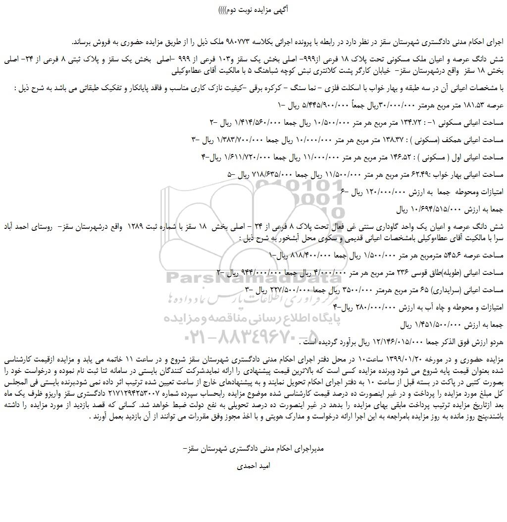 مزایده فروش شش دانگ عرصه و اعیان ملک مسکونی تحت پلاک 18 فرعی از999- اصلی -نوبت دوم, مزایده، مزایده فروش شش دانگ عرصه و اعیان ملک مسکونی تحت پلاک 18 فرعی از999- اصلی -نوبت دوم