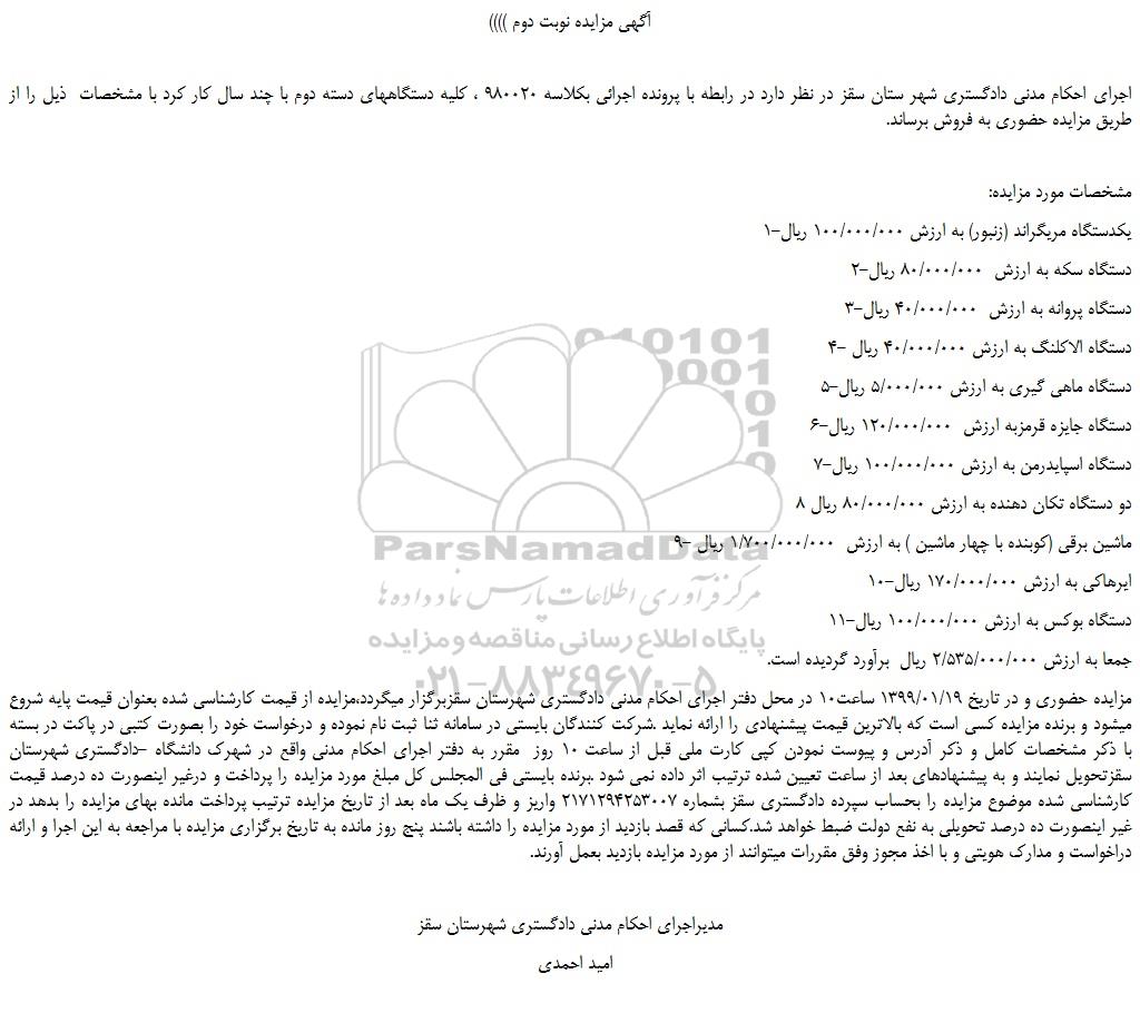 اجرای احکام مدنی دادگستری شهر ستان سقز در نظر دارد در رابطه با پرونده اجرائی بکلاسه 980020 ، کلیه دستگاههای دسته دوم با چند سال کار کرد با مشخصات  ذیل را از طریق مزایده حضوری به فروش برساند.