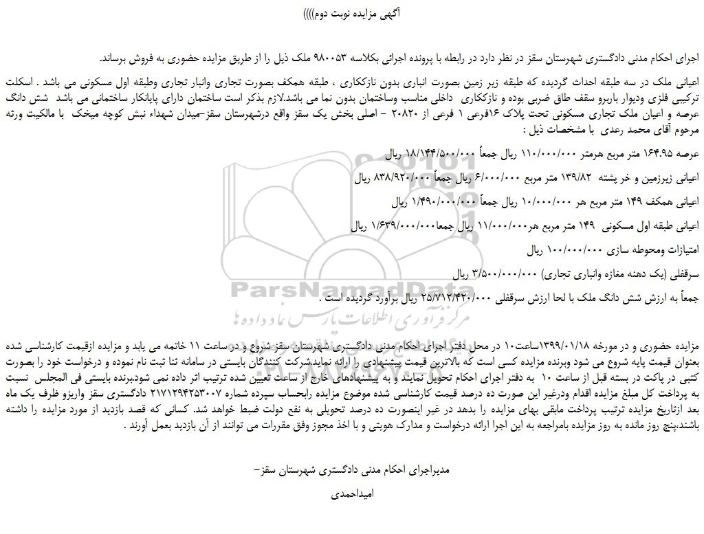 اجرای احکام مدنی دادگستری شهرستان سقز در نظر دارد در رابطه با پرونده اجرائی بکلاسه 980053 ملک ذیل را از طریق مزایده حضوری به فروش برساند.