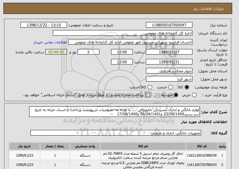 استعلام لوازم خانگی و اداری آبسردکن جاروبرقی .... با توجه به خصوصیات در پیوست پرداخت از اسناد خزانه به تاریخ سر رسید23/09/1400 و06/04/1401 و17/08/1400 , استعلام لوازم خانگی و اداری آبسردکن جاروبرقی .... با توجه به خصوصیات در پیوست پرداخت از اسناد خزانه به تاریخ سر رسید23/09/1400 و06/04/1401 و17/08/1400