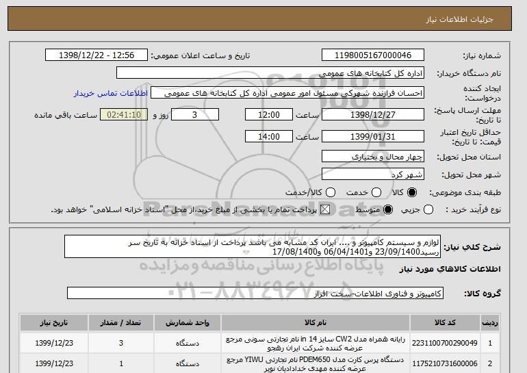 شرح کلی نیاز: لوازم و سیستم کامپیوتر و .... ایران کد مشابه می باشد پرداخت از اسناد خزانه به تاریخ سر رسید23/09/1400 و06/04/1401 و17/08/1400