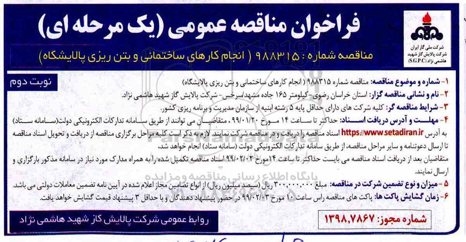 1. شماره و موضوع مناقصه: مناقصه شماره 988315 - انجام کارهای ساختمانی و بتن ریزی پالایشگاه