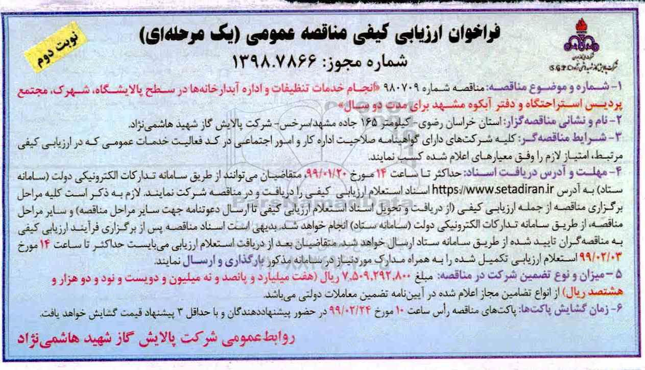 1- شماره و موضوع مناقصه : مناقصه شماره 980709 (انجام خدمات تنظیفات و اداره آبدارخانه ها در سطح پالایشگاه ، شهرک ، مجتمع پردیس استراحتگاه و دفتر آبکوه مشهد برای مدت دو سال )